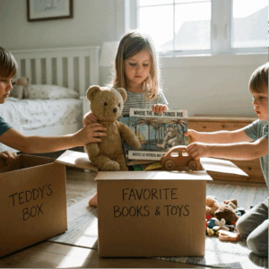Create a “first day” box for each child. Pack their essential items, favorite toys, comfort objects, and anything they’ll need for their first night in the new home. Label these boxes clearly and keep them easily accessible.