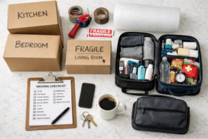 As you get closer to moving day, pack up your immediate necessities in suitcases or bags that you’ll keep with you. Think about what you’d pack for a weekend trip: clothes, toiletries, medications, phone chargers, important documents, and anything valuable or irreplaceable. If you want to make this even easier, build it around The Moving Day First Night Box so you’re not tearing through boxes at midnight looking for toothpaste. Those items don’t go on the moving truck. They go in your car where you can keep an eye on them.